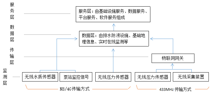 •2、传输层:传输层主要有无线采集装置、无线压力传感器、NB、4G、Lora无线传输网络组成。